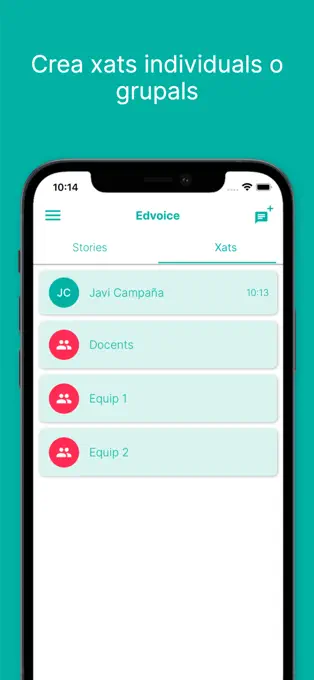 A més de les stories, on reps un flux de notificacions, l’aplicació també incorpora les funcionalitats de xats i els grups. A diferència de les stories és una missatgeria bidireccional per poder realitzar treballs en grups i facilitar l’intercanvi d’informacions amb els alumnes i les famílies.