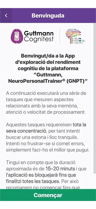 Guttmann CogniTest és una app d’exploració del rendiment cognitiu que, mitjançant tasques específiques que cal realitzar amb concentració durant aproximadament 20 minuts, permet mesurar aspectes relacionats amb la memòria, l’atenció, la lògica o la velocitat de processament.