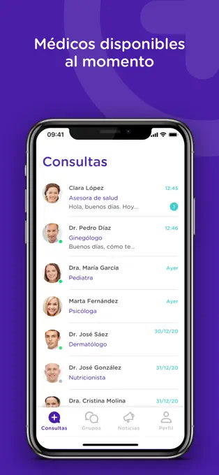 Parla amb doctors col·legiats de diferents especialitats. Si busques un dermatòleg, cardiòleg, ginecòleg, oftalmòleg o pediatre, en mediQuo podràs xatejar amb tots ells. Porta una vida més saludable i millora el teu benestar, xateja amb nutricionistes i entrenadors personals per a crear el teu pla d’entrenament i dieta personalitzats. La teva salut mental i tranquil·litat és molt important, xateja amb un psicòleg online que t’orientarà per a afrontar millor el teu dia a dia. Si el metge està online apareixerà en verd i podràs realitzar les teves preguntes mèdiques, i si està desconnectat apareixerà en vermell i et contestarà quan torni a estar connectat.