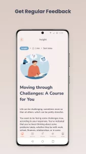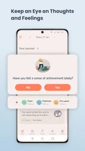 L’aplicació registra els teus pensaments i sentiments amb un seguiment intuïtiu de l’estat d’ànim i reps comentaris personalitzats sobre la teva salut emocional. Les avaluacions generades poden ser descarregades i compartides amb professionals sanitaris. També pots accedir a una biblioteca de continguts interactius basats en teràpia cognitivoconductual (TCC), adaptats als teus símptomes i necessitats.