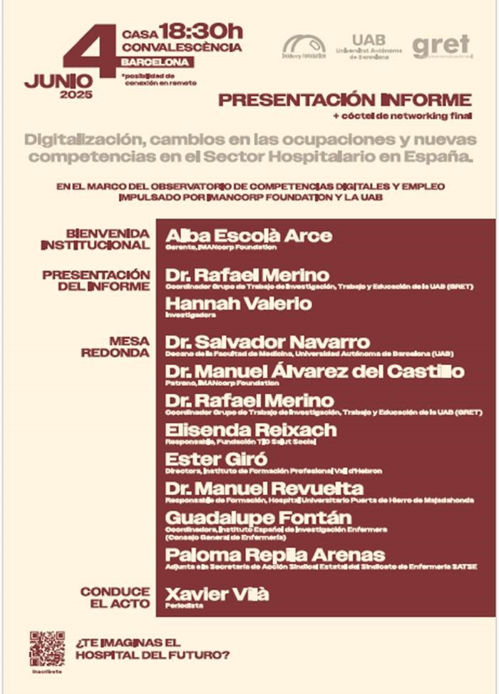 El próximo 4 de junio en la Casa Convalecencia, se presentará el informe «Digitalización, cambios en las ocupaciones y nuevas competencias en el Sector Hospitalario en España» a las 18:30 h.