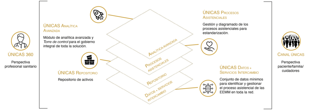 Dispone de dos visiones: UNICAS 360 (perspectiva del profesionales sanitario), y CANAL UNICAS (perspectiva paciente/familiar/cuidador).