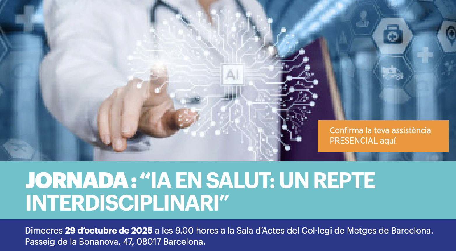 El proper 29 d’octubre, l’Associació GIPS, BioInformàtics Barcelona, FENIN, Àrea d’Innovació i Emprenedoria del CoMB i Medidedàlia organitzen la jornada “IA en salut: un repte interdisciplinari”. Serà una jornada orientada a:
