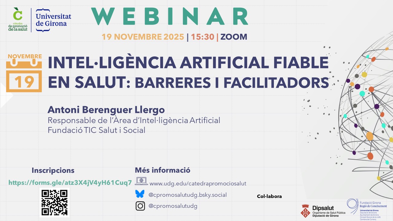 La Càtedra de Promoció de la Salut de la Universitat de Girona organitza el webinar ‘Intel·ligència artificial fiable en salut: barreres i facilitadors’, a càrrec del Responsable d’Intel·ligència Artificial de la Fundació TIC Salut i Social, Antoni Berenguer.
